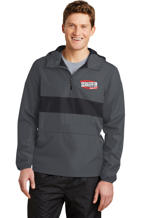 Anorak Pullover Embroidered - Sport-Tek Zipped Pocket Anorak. A zippered pocket keeps valuables accessible and secure in this element-beating anorak. 100% polyester shell 100% polyester mesh body and hood lining 100% polyester woven sleeve lining Tag-free label Three-panel hood with drawcord and toggles Angled chin guard for additional comfort Exposed molded zipper Stretch binding at cuffs Left side seam zipper for easy on/off Two pockets in one: front pocket includes a top zippered pocket to secure valuables Slight drop tail hem Drawcord hem with toggles Product Spec Sheet