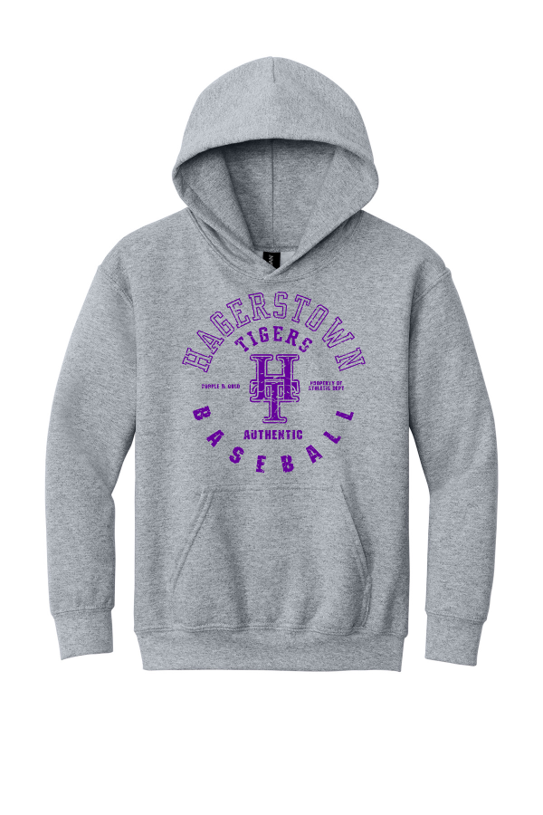 YOUTH Hagerstown Baseball Hooded Sweatshirt Gildan - Youth Heavy Blend Hooded Sweatshirt. 8-ounce 50/50 cotton/poly Double-needle stitching at waistband and cuffs Double-lined hood No drawcord at hood 1x1 rib knit cuffs and waistband with spandex Front pouch pocket Recycled high-performing black tear-away labelPlease note: This product is transitioning from tear-away labels to recycled high-performing black tear-away labels. Your order may contain a combination of both labels. Product Spec Sheet
