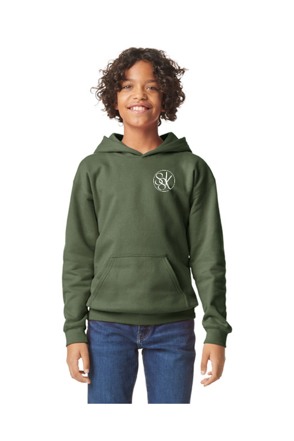 YOUTH SSK Design #2 Hoodie Youth Gildan Softstyle Midweight Fleece Hooded Sweatshirt 8.4 oz/SqYd, 20/1, 80% ring spun cotton, 20% polyester; Softstyle Midweight Fleece features a cozy, brushed interior and a 100% ring spun cotton face, ideal for a variety of cotton friendly decorating techniques; Made with OEKO-TEX certified low-impact dyes; Jersey lined hood, no drawcords; Pouch pocket; 1x1 rib with spandex cuffs and bottom band for enhanced stretch and recovery; Classic fit, seamless body; CPSIA Tracking Label Compliant; Tear away label; Gildan partners with Better Cotton to improve cotton farming globally; Plastic waste is diverted from landfills annually by the removal of polybags from all products except color white;
