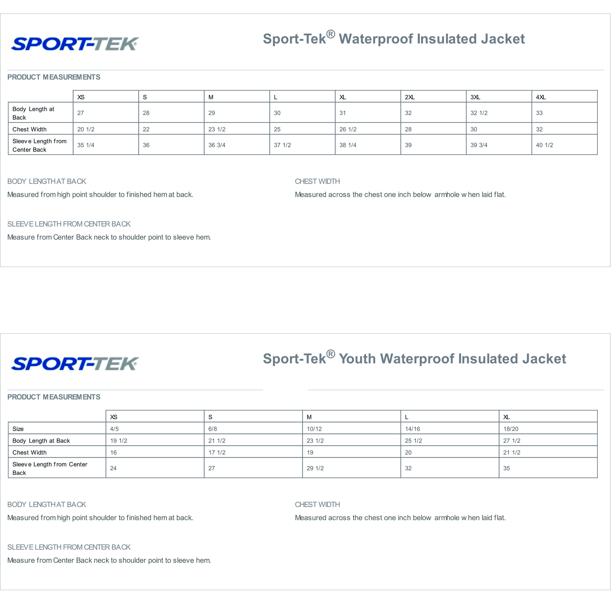 Waterproof Insulated JacketSport-Tek Waterproof Insulated JacketThis fully seam-sealed insulated jacket offers outstanding wind-resistant water-repellent protection to help keep you dry in the stands or on the street. 100% polyester with waterproof face coating Jersey-lined body and hood 2.4-ounce polyfill insulation in body 1.8-ounce polyfill insulation in hood and sleeves Polyester taffeta sleeves for easy on/off 5000MM fabric waterproof rating 3000G/M2 fabric breathability rating Tag-free label Three-panel hood with drawcord and toggles Exposed molded zipper Left arm zippered pocket Adjustable self-fabric tab cuffs with hook and loop closures Front pouch pocket Decoration access pocket Adjustable locking drawcord at hemProduct MeasurementsProduct Spec Sheet |
