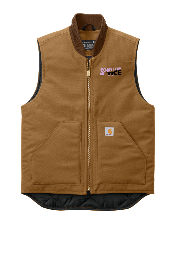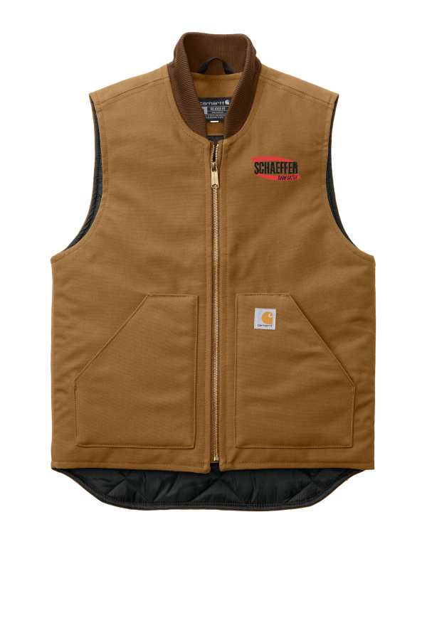 Duck Vest Carhartt Duck Vest. A great extra layer Carhartt s Duck Vest is made of cotton duck and insulated for warmth. 12-ounce firm hand 100% ring spun cotton duck canvas Wind Fighter technology tames wind Nylon lining quilted to arctic-weight 100% polyester insulation Rib knit collar Brass center-front zipper with interior storm flap Interior pocket with hook and loop closure Two large insulated lower-front pockets Locker loop Drop tail hem Carhartt-strong triple-stitched main seams Carhartt label sewn on left pocketRelaxed fit Product Spec Sheet