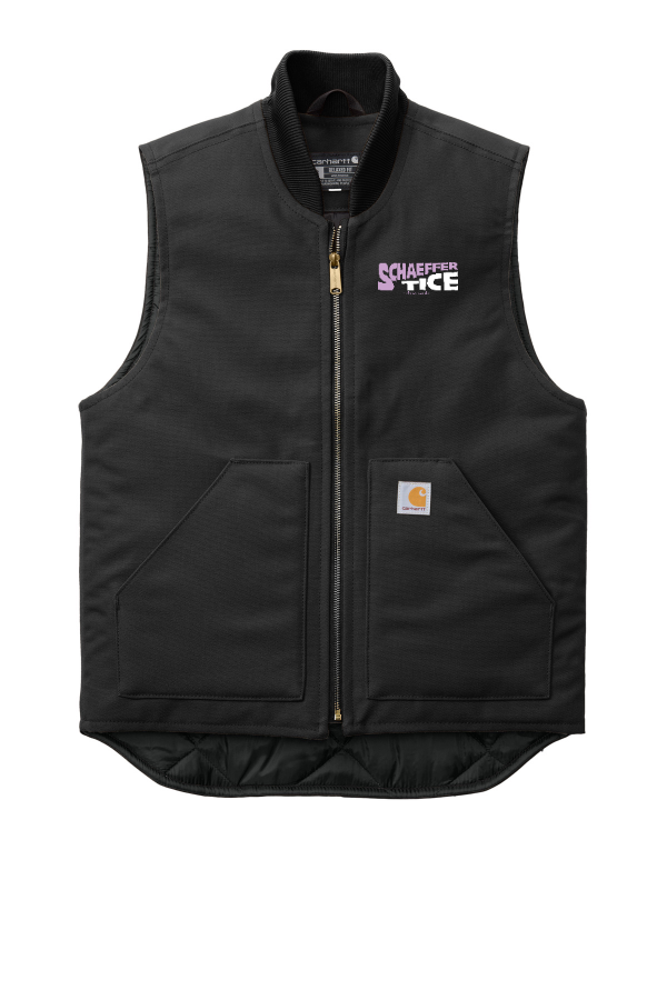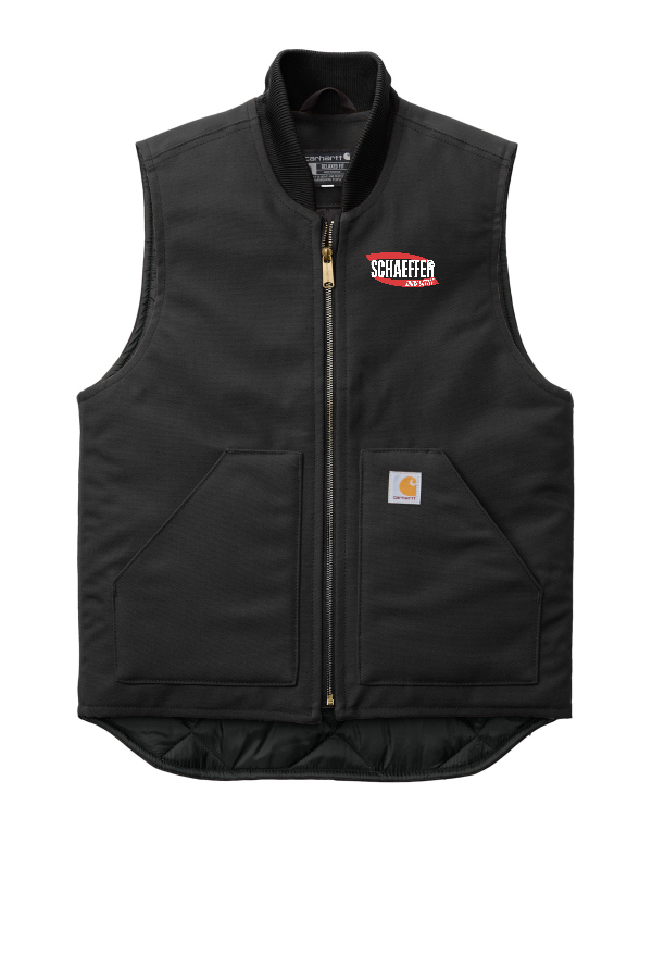 Description A great extra layer Carhartt s Duck Vest is made of cotton duck and insulated for warmth. 12-ounce firm hand 100% ring spun cotton duck canvas Wind Fighter technology tames wind Nylon lining quilted to arctic-weight 100% polyester insulation Rib knit collar Brass center-front zipper with interior storm flap Interior pocket with hook and loop closure Two large insulated lower-front pockets Locker loop Drop tail hem Carhartt-strong triple-stitched main seams Carhartt label sewn on left pocketRelaxed fit